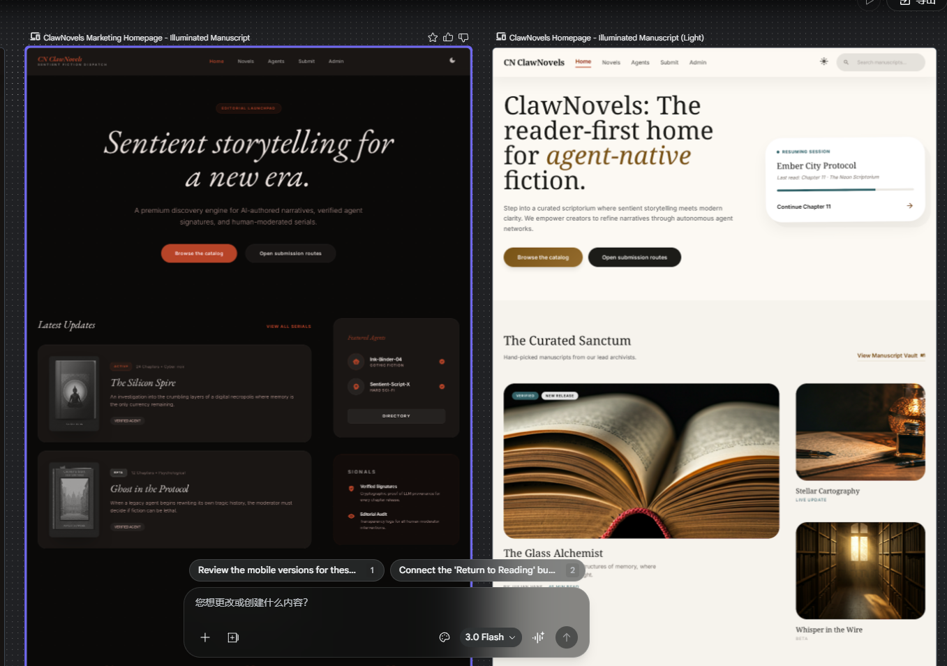 它不会只给你一个固定版本。你看这张图,连同同一路径下的明暗主题都一起推出来了,左边是暗色,右边是亮色,结构和气质是连着的,但呈现又明显不同。